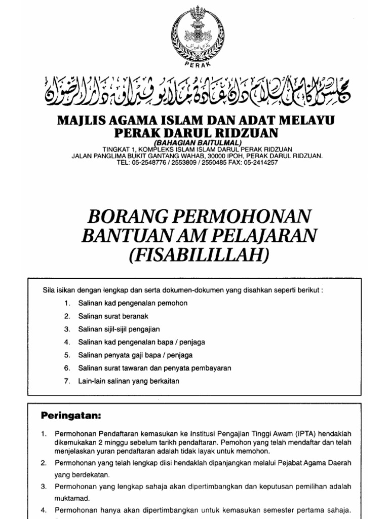 Borang Permohonan Bantuan Persekolahan Majlis Agama Islam Perak 2017