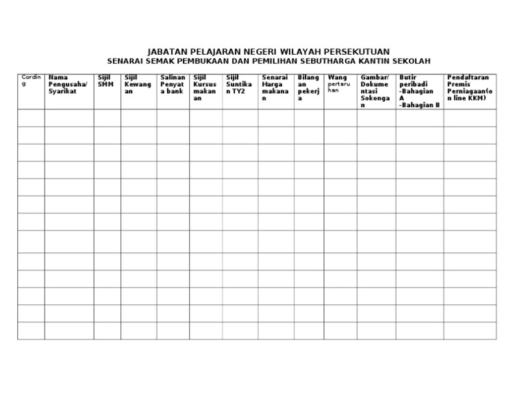 Senarai Semak Sebut Harga Kantin Sekolah