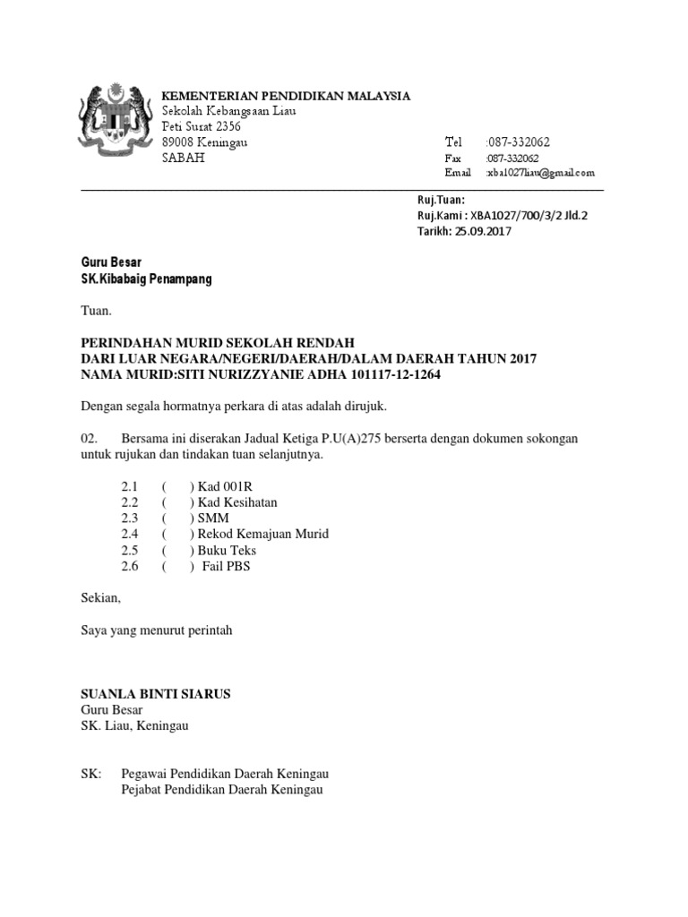 Contoh Surat Rasmi Pertukaran Sekolah Pelajar Rasmi H
