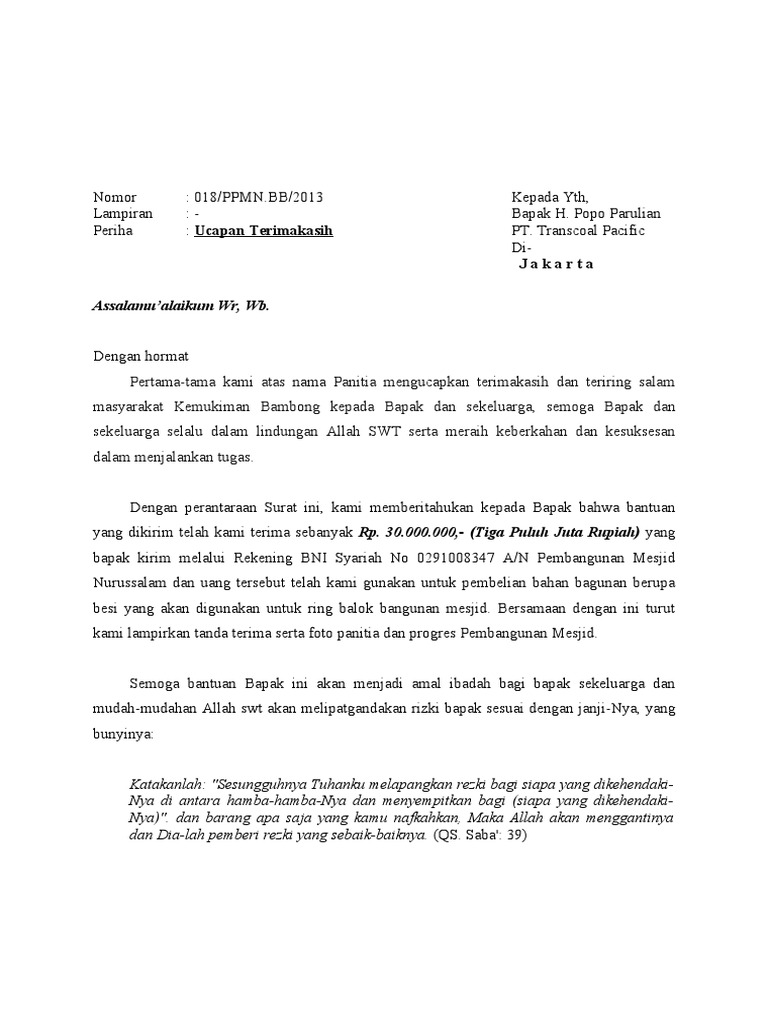 Contoh Surat Ucapan Terima Kasih Atas Bantuan Dana Pembangunan Masjid Bagikan Contoh