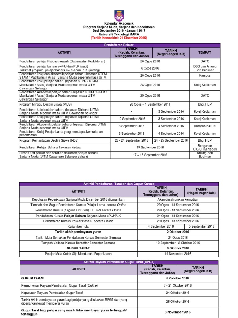 Kalendar Akademik Program Sarjana Muda Sarjana Dan Kedoktoran Sesi September 2016 Januari 2017 Universiti Teknologi Mara