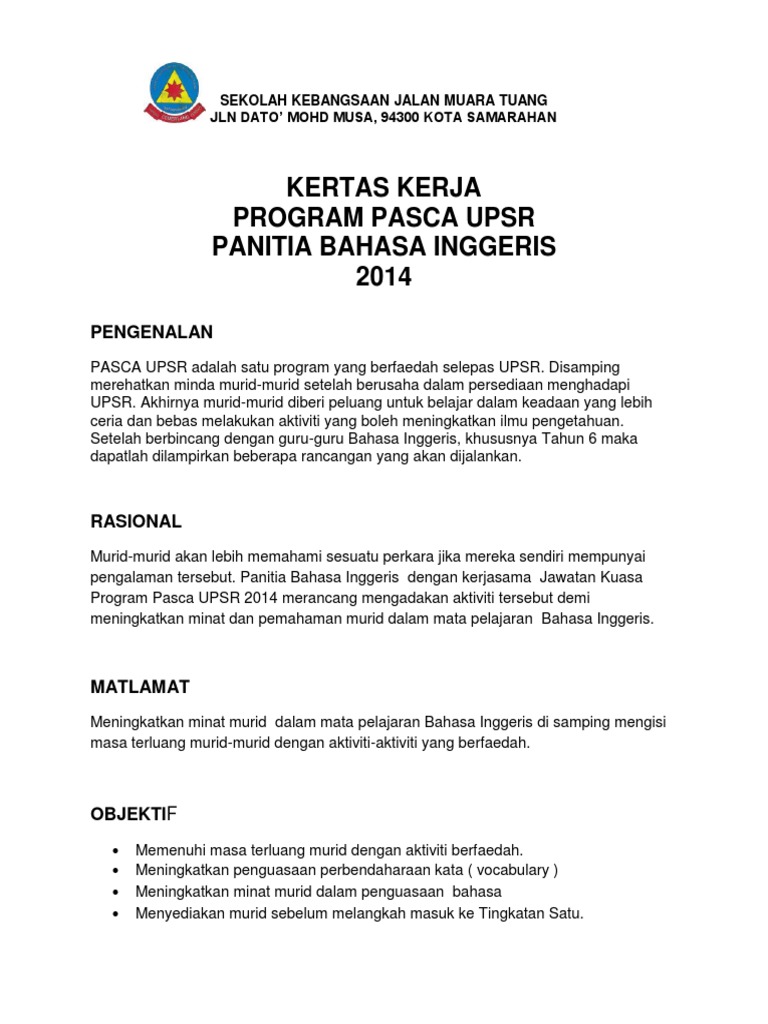 Contoh Kertas Kerja Program Pasca Upsr Docx Document