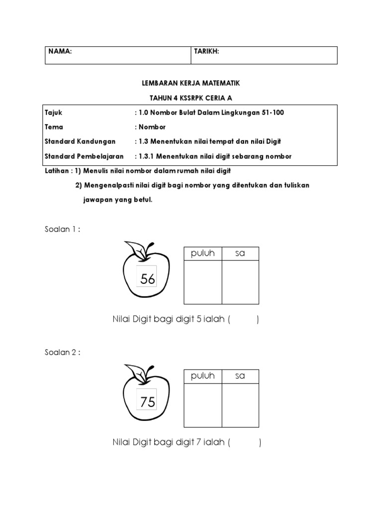 Latihan Nilai Tempat Dan Nilai Digit Tahun 1