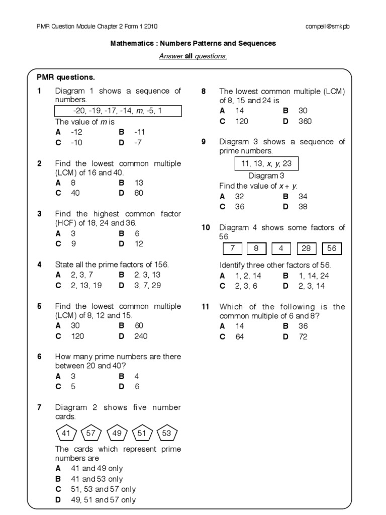 Chapter 2 Math Form 1 Topical Test Paper 1 Prime Number Mathematical Concepts