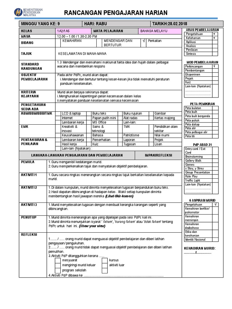 Rancangan Pengajaran Harian Bm Kssm Tingkatan 1