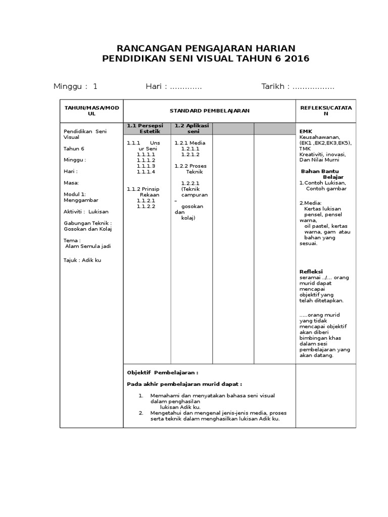 Doc Rancangan Pengajaran Harian Pendidikan Seni Visual Bil Perkara Dyana Nonong Academia Edu