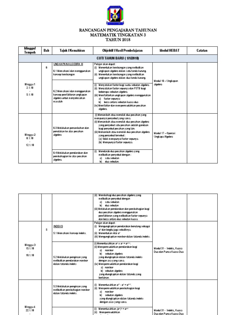Download Rpt Matematik Tingkatan 3 Terhebat Rpt Rancangan Pengajaran Tahunan Tingkatan 3 Semua Subjek Skoloh
