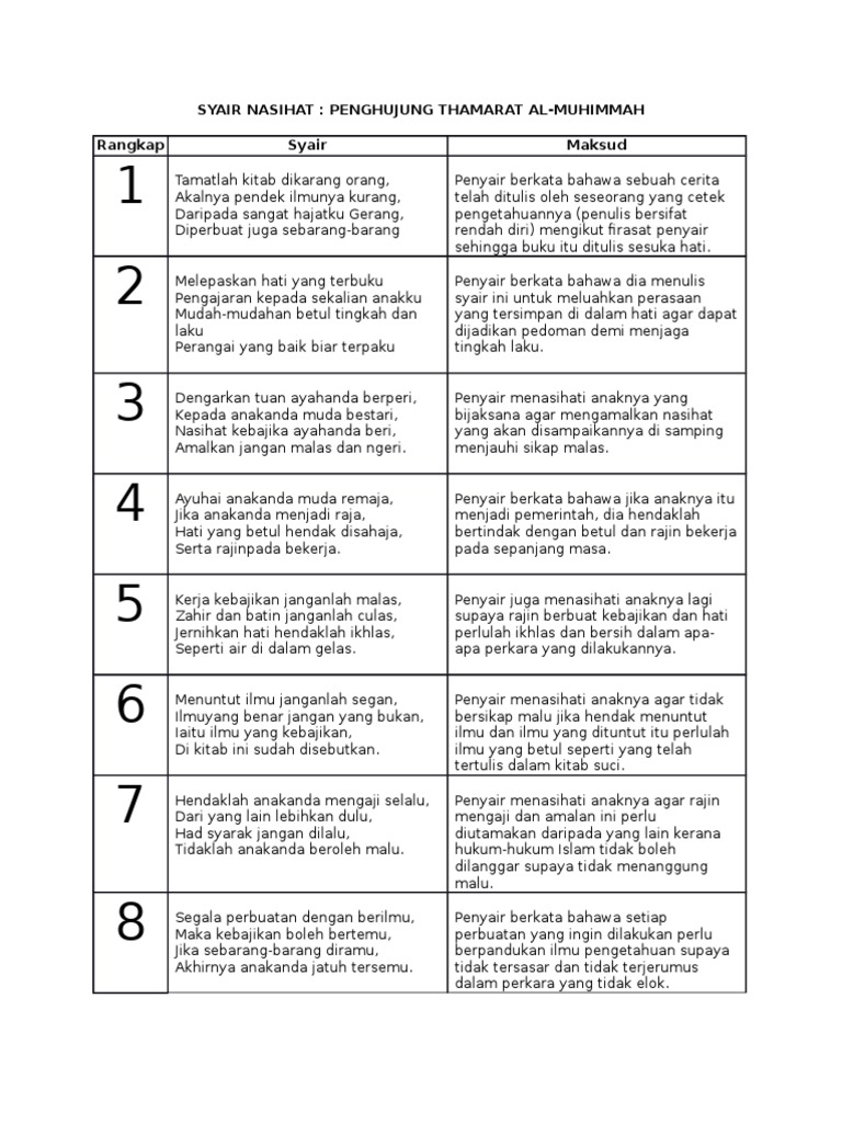 Bahasa Melayu Tingkatan 2 Syair Nasihat Penghujung Thamarat Al Muhimmat